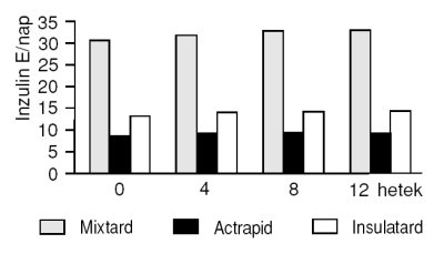 A tanulmányba bevont betegek átlagos napi inzulindózisa a beválasztási előperiódusban 0,61+/-0,20 E/kg (48+/-17 E) volt. A 0. héten, a szemi-intenzív kezelésre való áttéréskor a napi dózis minimális emelésére került sor (0,65+/-0,19 E/kg; p=0,04), a későbbiekben a dózisnövelés kevésbé volt kifejezett (4. hét: 0,68+/-0,19 E/kg p=0,04; 8. hét: 0,69+/-0,20 E/kg p=0,02); a 12. héten pedig csekély dóziscsökkentés volt megfigyelhető (0,68+/-0,20 E/kg p<0,01). Az átlagos dózismódosítás a tanulmány folyamán 6 E-nek adódott. A szemi-intenzív kezelésben szereplő inzulinok arányát és napi átlagos mennyiségét az 1. ábra szemlélteti.