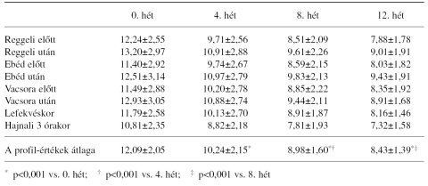 A vizsgálati periódusban a 8 pontos vércukorprofil értékei fokozatosan, számottevően csökkentek (1. táblázat), az átlagértékek alakulását a 2. ábra mutatja. A napi vércukorátlag a kiindulási értékhez viszonyítva a megfigyelés végére szignifikánsan (p<0,001), 3,73 mmol/l értékkel (3. ábra), az egy napon mért vércukorprofil maximum-minimum értéke közötti különbség szintén számottevően (p<0,001), 2,42 mmol/l értékkel csökkent (4. ábra).